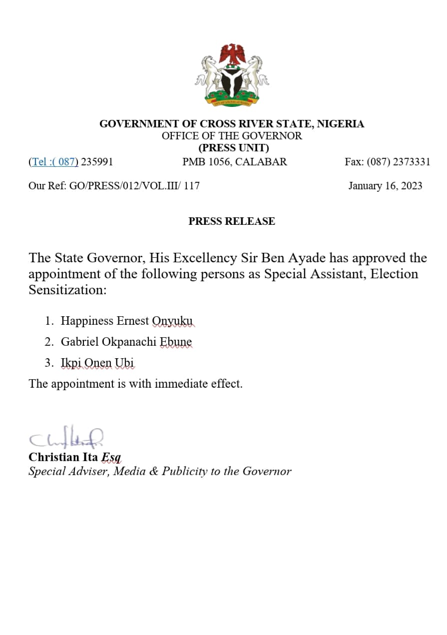 Governor of Cross River State, Sen. Ben Ayade has appointed Happiness Onyuku and Gabriel Ebune as Special Assistant, Election Sensitization.