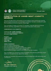 The Office of the Executive President of the Students’ Union Government (SUG), University of Calabar, has officially announced the constitution of a seven-member committee to plan and coordinate the forthcoming SUG Award Night.