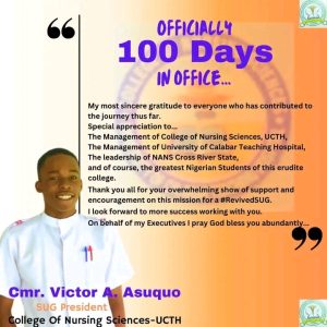 In the history of student leadership at the College of Nursing Sciences, University of Calabar Teaching Hospital (UCTH), Calabar, the administration led by Comr. Victor Antigha Asuquo will be remembered as a period marked by deliberate reform, student inclusion, institutional visibility, and a renewed sense of purpose in student unionism.