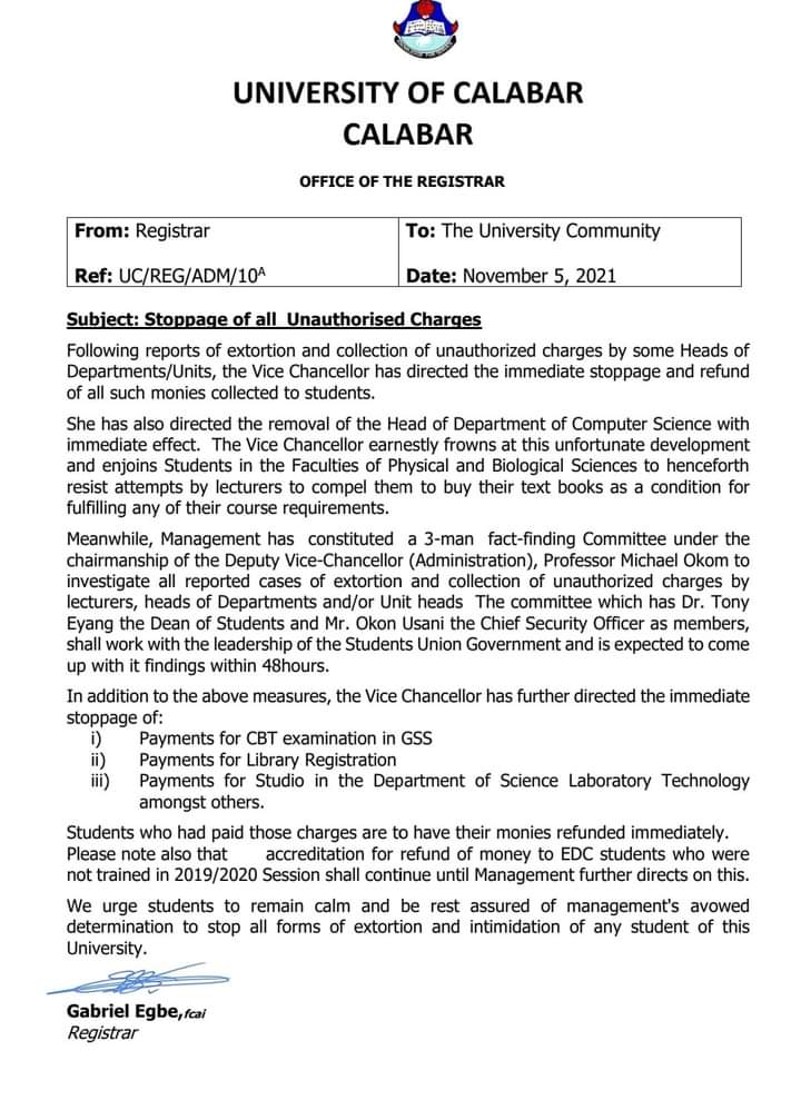 As a result of incessant increase of unauthorized charges by some Lecturer of the University of Calabar, the school management under the leadership of Prof. Florence Banku Obi has ordered the immediate stoppage of unauthorized charges levied on students by some heads of Departments/Unit.