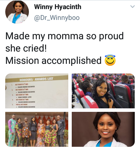 An elated Winifred took to her official Twitter handle @Dr_Winnyboo on Monday, January 18, to share how she made her mother proud with the feat.