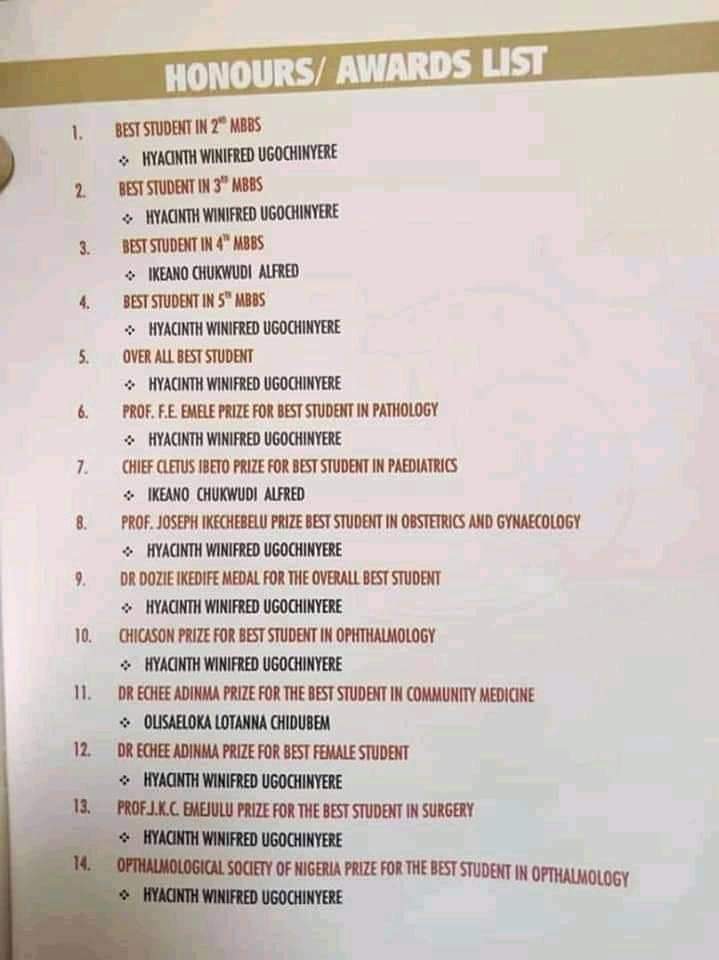 Other awards include Prof. Emele prize for best student in Pathology, Prof. Joseph Ikechebelu prize for best student in Obstetrics and Gynaecology, Dr. Dozie Ikedife medal for the overall best student, Dr. Echee Adinma prize for best student in Community Medicine, and best female student, Prof. Emejulu prize for the best student in Surgery, among others.